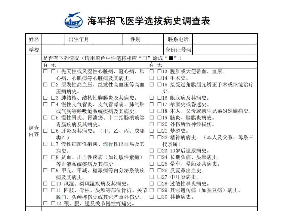 (一)参检学生务必携带本人身份证原件,家庭户口簿原件,《海军招飞初检预选合格对象登记表》(海军招飞网政治考核申报后自行下载打印),《海军招飞体检病史调查表》(可从海军招飞网“资料下载”专栏自行下载填写打印)等相关材料。自备洗漱用品和医用口罩和200元现金(用于检测证押金等)。
