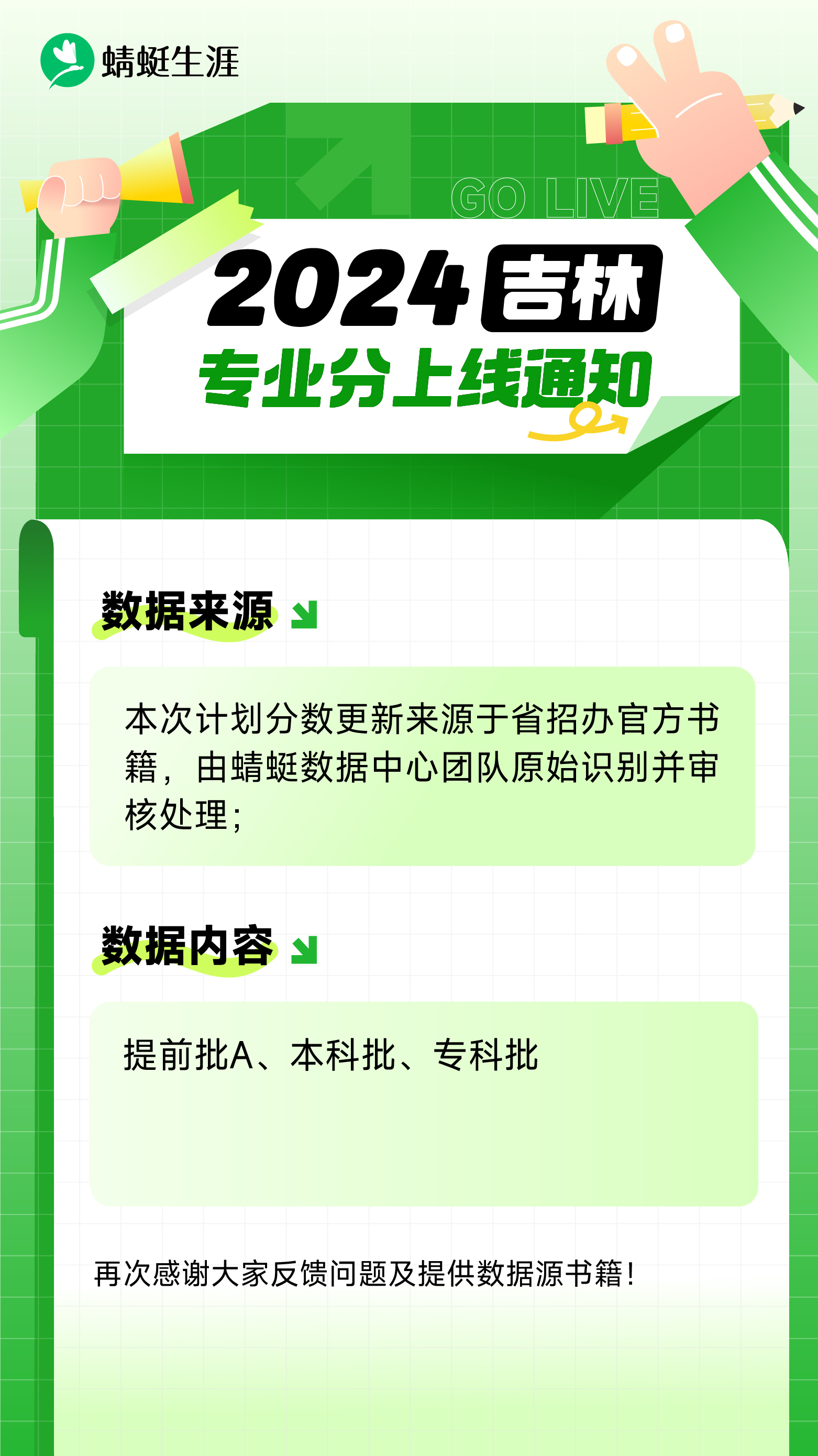 🎈重要消息!2024 年【吉林】专业分上线通知来啦! 数据更新 5月29日 -常程- 取消关注 关注 私信 涵盖提前批 A、本科批、专科批关键批次信息。本次计划分数更新,均源自省招办官方书籍,经蜻蜓数据中心团队专业识别与严格审核,靠谱有保障! 老师们别错过这些重要数据哦,为学生的升学之路精准导航~