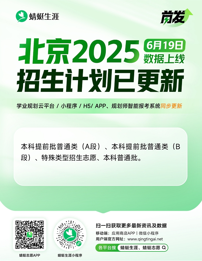 🎇[行业首发]北京2025本科招生计划蜻蜓新鲜出炉啦! 数据更新 6月20日 -常程- 取消关注 关注 私信 ✅更新批次:本科提前批普通类(A段)、本科提前批普通类(B段)、特殊类型招生志愿、本科普通批~ 💪数据源自省招办官方考试报,经蜻蜓数据中心严格审核,靠谱有保障!快到系统体验吧~